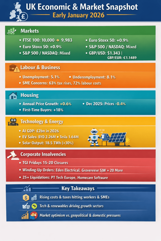 The UK economy begins 2026 under a complex mix of optimism and caution. The FTSE 100 briefly breached the symbolic 10,000-point mark, signalling international investor interest, while broader business confidence remains subdued. Rising costs from tax changes, National Insurance hikes, and higher minimum wages are already reshaping employment and corporate strategies, with analysts warning of a potential uptick in insolvencies across retail, hospitality, and leisure sectors. Meanwhile, innovation and technology provide a glimmer of hope: AI and renewable energy are driving growth, while the EV market sees a dramatic reshuffle as China’s BYD overtakes Tesla in global sales.