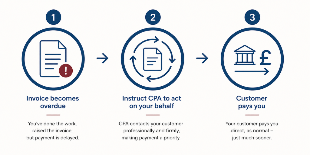 CPA’s guidance puts this clearly: delayed follow-up weakens payment urgency, increases dispute risk and makes repayment harder to secure. CPA helps businesses protect cashflow while preserving customer relationships.